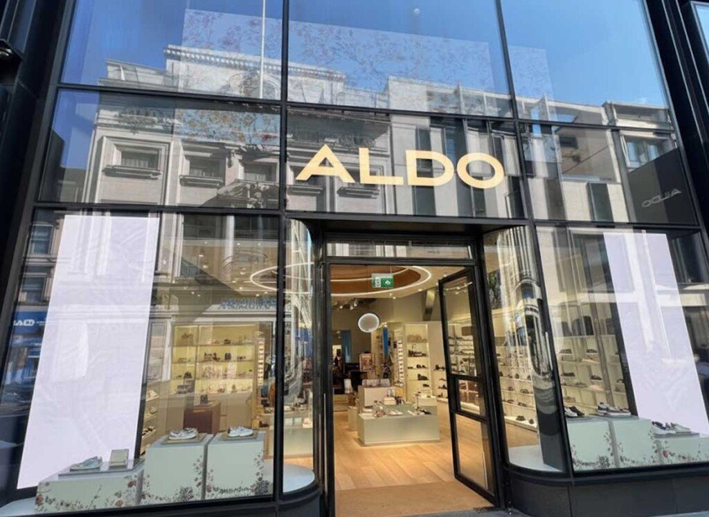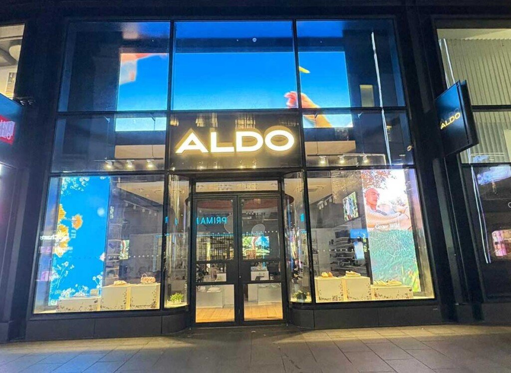 Gold Exterior Signage & Urban Façade: We installed large-format gold ALDO lettering above a full-glass storefront, creating a bold and upscale visual anchor in the retail landscape.