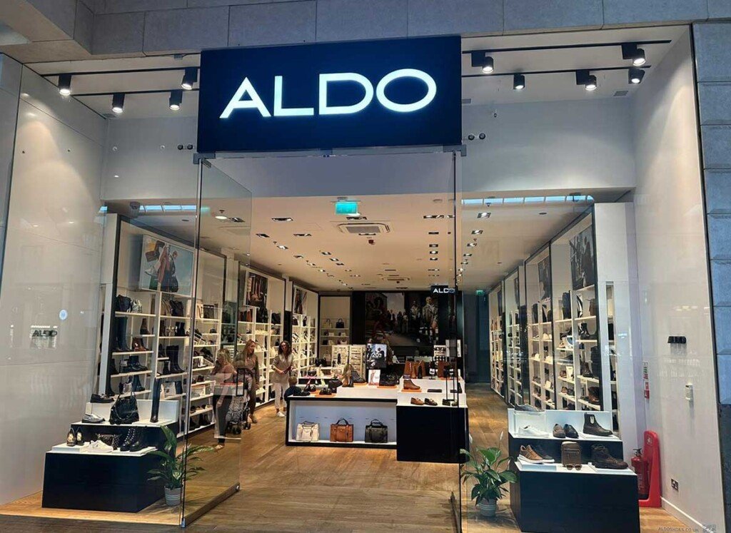 Black & White Storefront Design: We installed a bold illuminated ALDO logo in white against a matte black fascia, creating a strong visual anchor and brand recall from a distance.