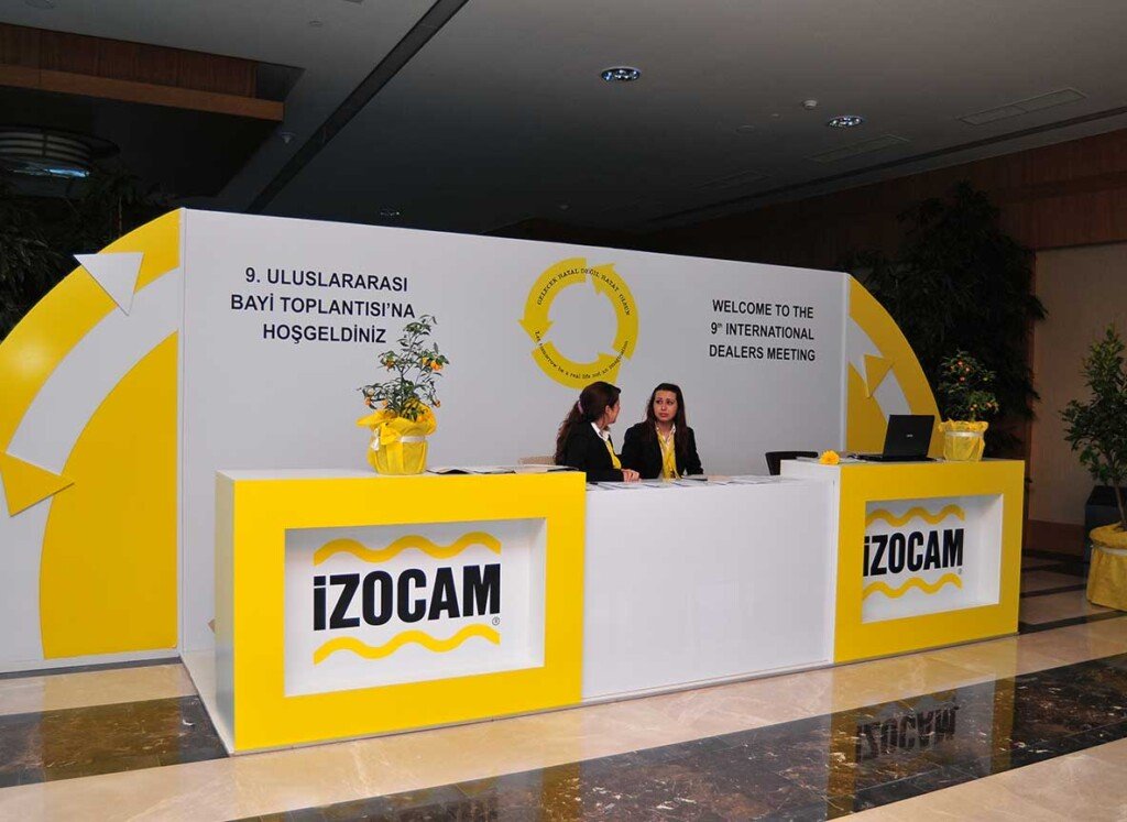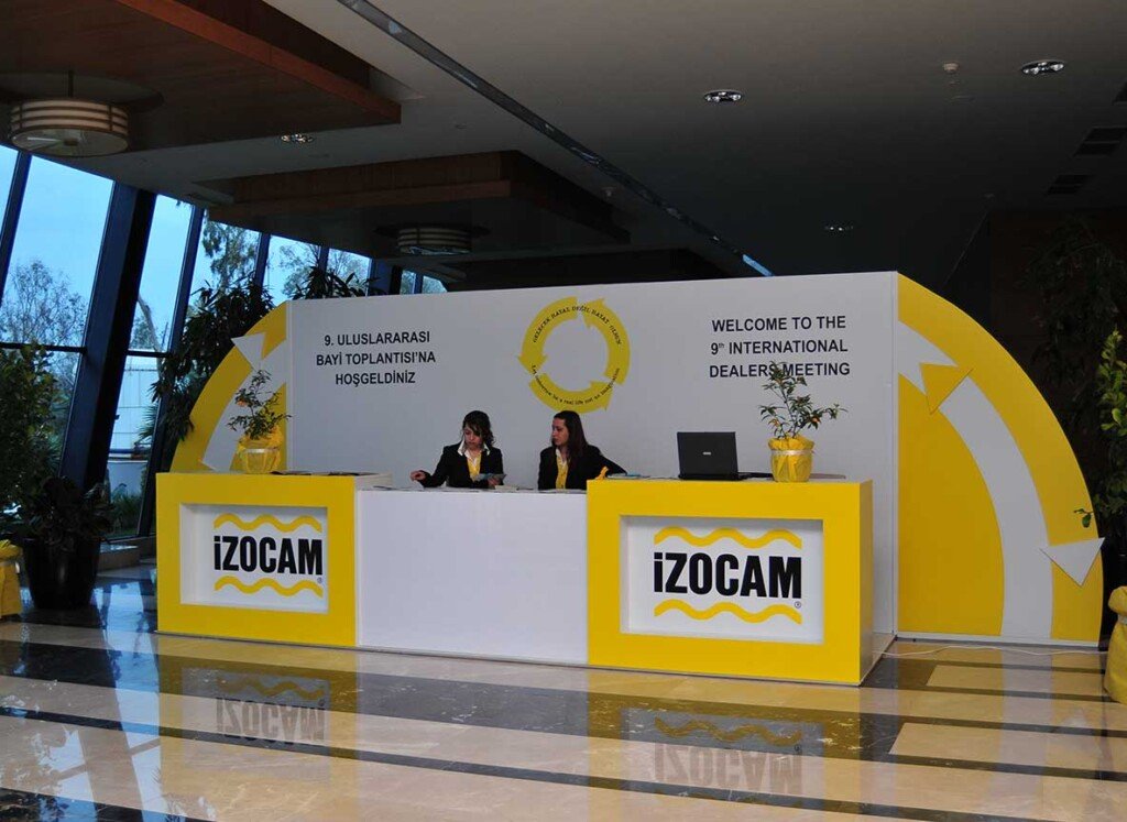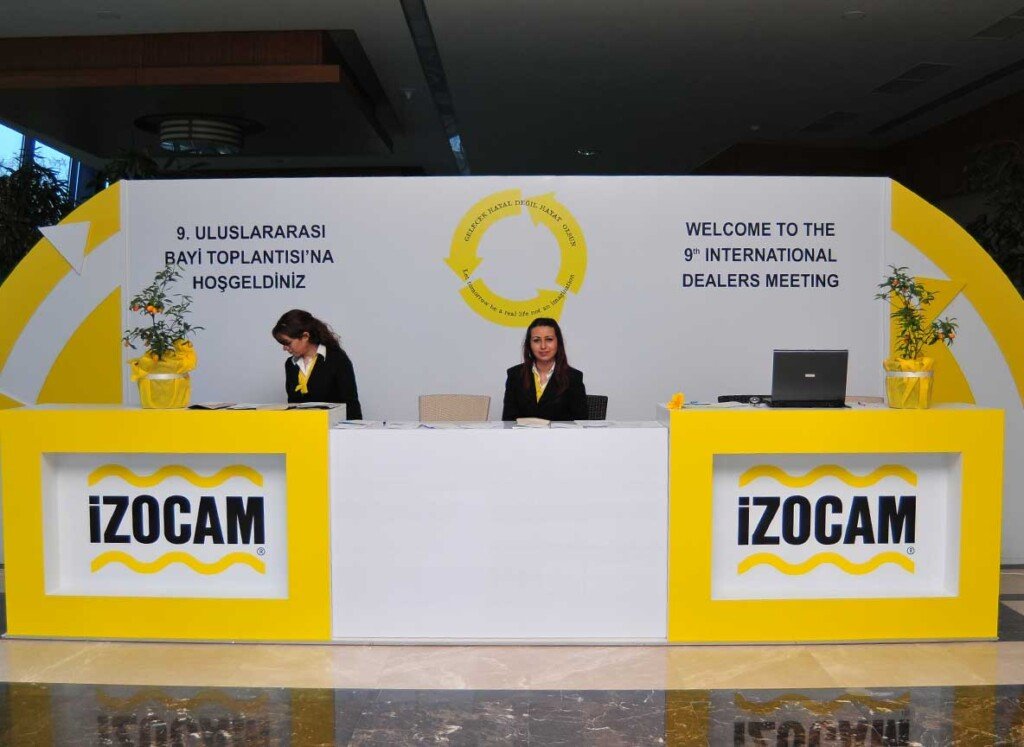 Branded Registration Desk: We produced custom front panels for the reception desk featuring the İZOCAM logo and corporate colours. The design ensured visibility from multiple angles and created a professional first impression.