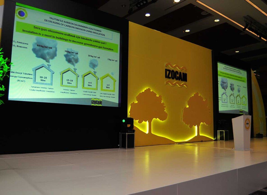 We were commissioned to design and install branded visuals for İZOCAM’s international dealer conference, held in a modern venue with high visibility and professional standards. The client requested bilingual messaging, corporate branding, and a cohesive visual identity across the event space.
