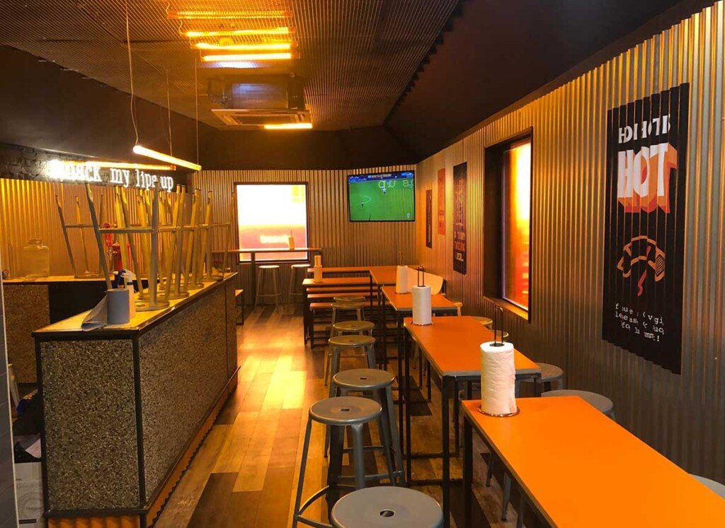 Interior Décor & Fixtures: Inside, we designed and installed corrugated metal wall panels, branded counter graphics, and orange-accented tabletops. The industrial aesthetic was balanced with warm lighting and functional seating, creating a casual yet distinctive atmosphere.