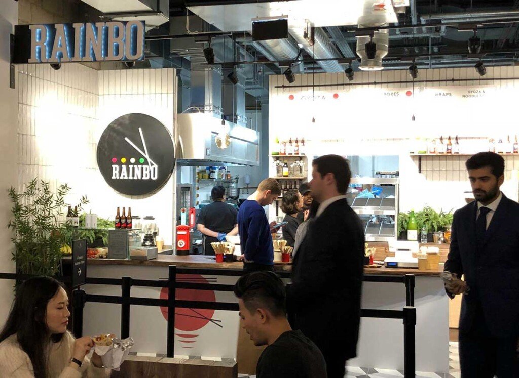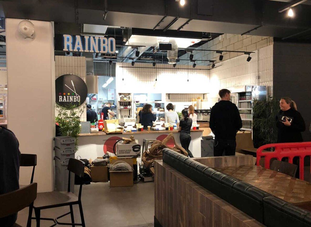 Interior Styling & Materials: White tiled walls, exposed piping, and industrial shelving were used to create a clean, urban aesthetic. The circular RAINBO logo was prominently displayed to reinforce brand identity.